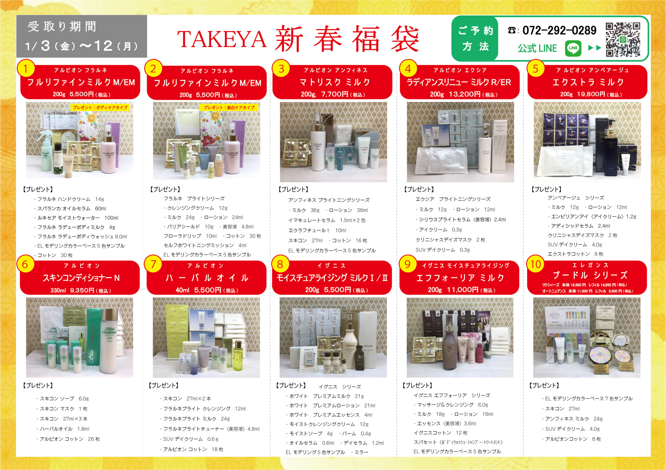 2026年福袋のご予約受付スタート! ご予約は、店頭、電話<072-292-0289>、LINE公式アカウントにて、お受けしております。 ご予約の際に『希望商品(1~10の番号と商品名を画像より確認ください)』・『お名前』・『ご連絡先』をお伝えください。 店頭での受取り期間は、1月3日(土)~12日(月)です。 数に限りがございます。売り切れの場合は、ご容赦ください。